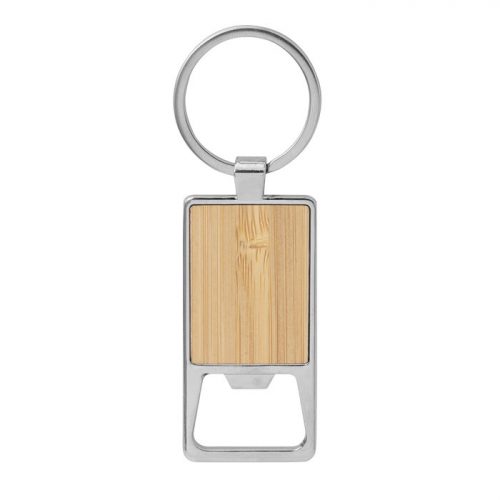Llavero con forma circular. Estructura metálica con aleación de zinc con acabado brillante y panel frontal de bambú barnizado.