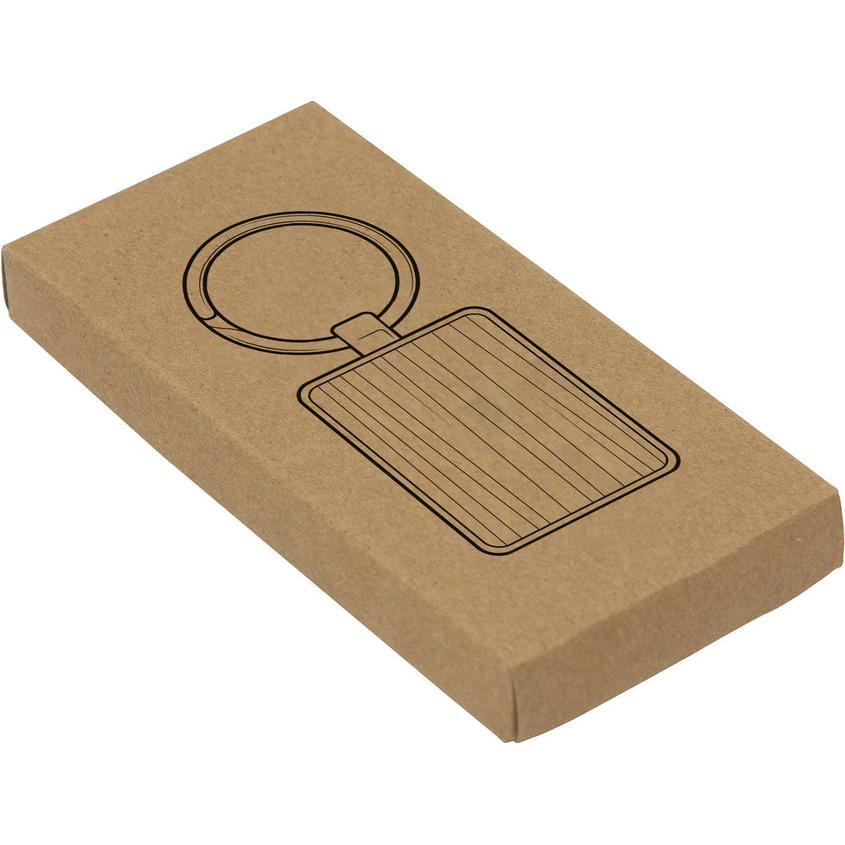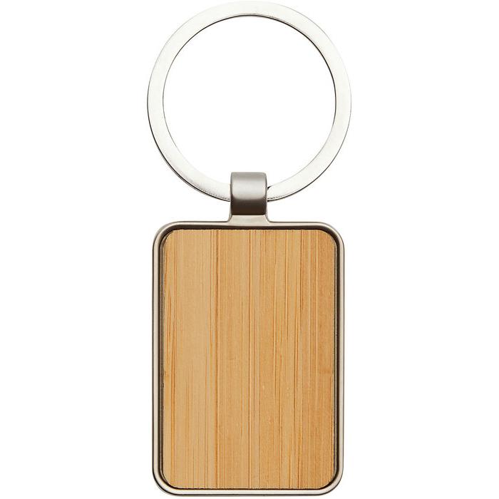 Llavero con forma rectangular. Estructura metálica con aleación de zinc con acabado brillante y panel frontal de bambú barnizado.