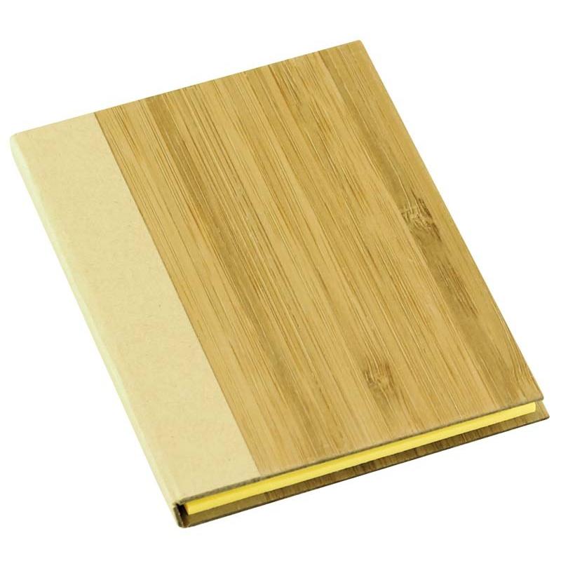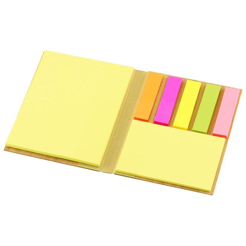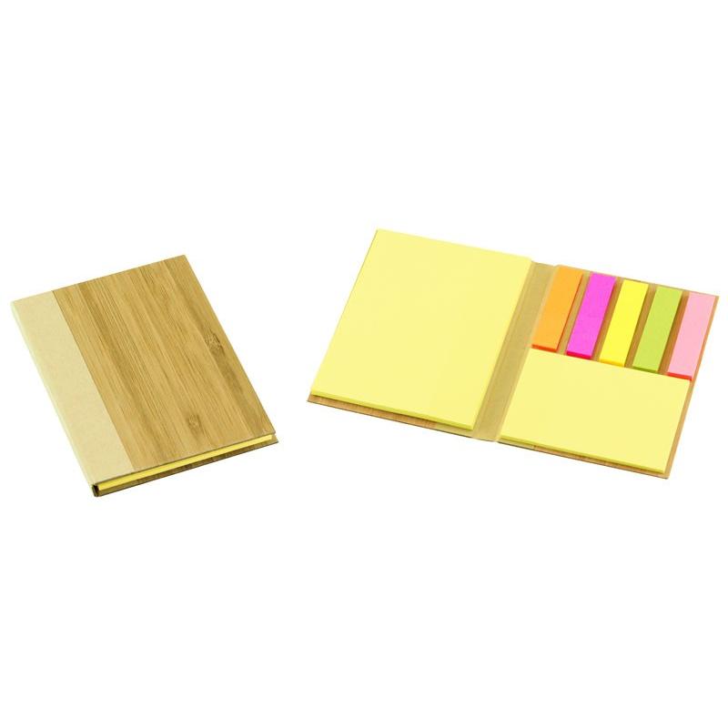 Memo Set con Tapas Duras enchapadas en madera de Bamboo. Incluye 50 post-it amarillos grandes, 25 post-it amarillos medianos y 125 banderitas adhesivas de colores.