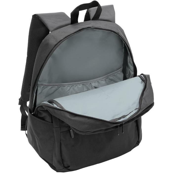 Mochila Portanotebook de hasta 16″. Tamaño 32 x 45 x 16 cm. Capacidad 25 litros. Poliéster 600D. Bolsillo frontal con cierre y dos bolsillos laterales para botella o Mug. Dos compartimentos con cierre. Compartimento principal con bolsillo porta notebook y documentos. Compartimento intermedio con cuatro bolsillos pequeños y gancho plástico en su interior. Estructura, espalda y correas acolchadas. Tiradores de cierres metálicos en color negro.