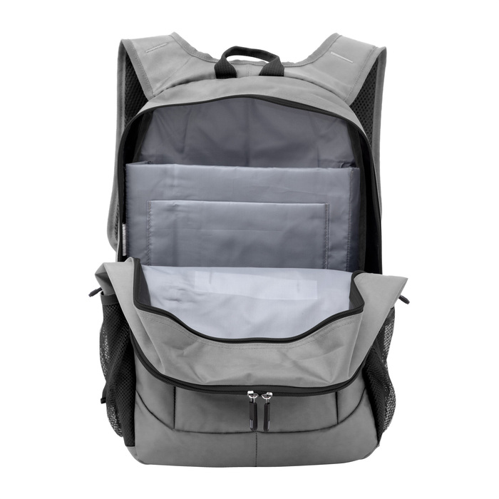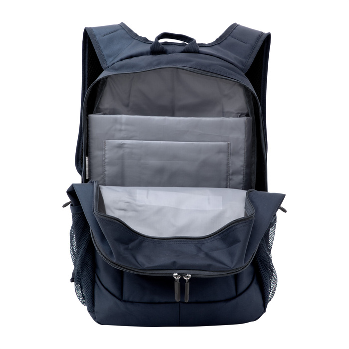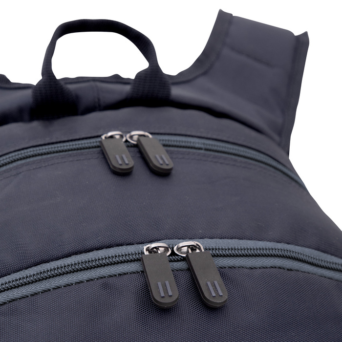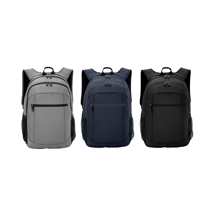 Mochila portanotebook de hasta 16 pulgadas. 2 compartimentos con doble cierre.  Amplio compartimento principal posterior con bolsillos acolchados portanotebook y portatablet. Compartimento frontal, interior con bolsillos organizadores y 1 bolsillo frontal con cierre horizontal. 2 Bolsillos laterales de red elastizados porta botellas y accesorios. Asa superior, correas ajustables reforzadas y acolchadas, unidas en su parte superior para mayor resistencia, protección y comodidad. Espalda acolchada. Cierres metálicos con deslizadores de goma con detalles de color.