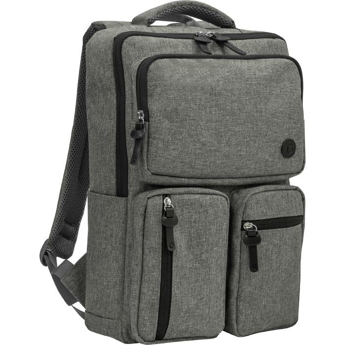 Tamaño 27 x 41 x 10 cm. Capacidad 12 litros. Poliéster 600D Bicolor + Nylon + PU. Mochila portanotebook de hasta 15,6 pulgadas. Compartimento principal con bolsillos acolchados para notebook y tablet con cinta elástica de velcro. 3 bolsillos delanteros con cierre y 2 bolsillos laterales. Manija y correas acolchadas, hebillas plásticas y cierres metálicos con tiradores en PU. Espalda acolchada. Incluye tira para sujetar la mochila en la manija extensible de un equipaje de mano.