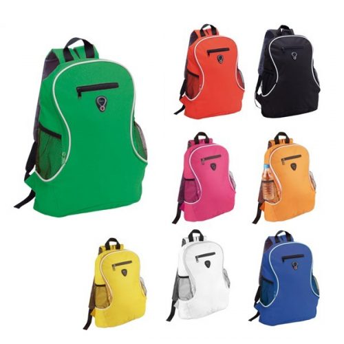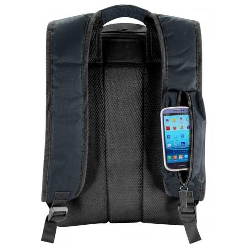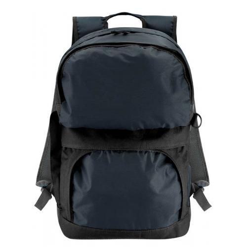 Tamaño 27 x 41 x 10 cm. Capacidad 12 litros. Poliéster 600D Bicolor + Nylon + PU. Mochila portanotebook de hasta 15,6 pulgadas. Compartimento principal con bolsillos acolchados para notebook y tablet con cinta elástica de velcro. 3 bolsillos delanteros con cierre y 2 bolsillos laterales. Manija y correas acolchadas, hebillas plásticas y cierres metálicos con tiradores en PU. Espalda acolchada. Incluye tira para sujetar la mochila en la manija extensible de un equipaje de mano.