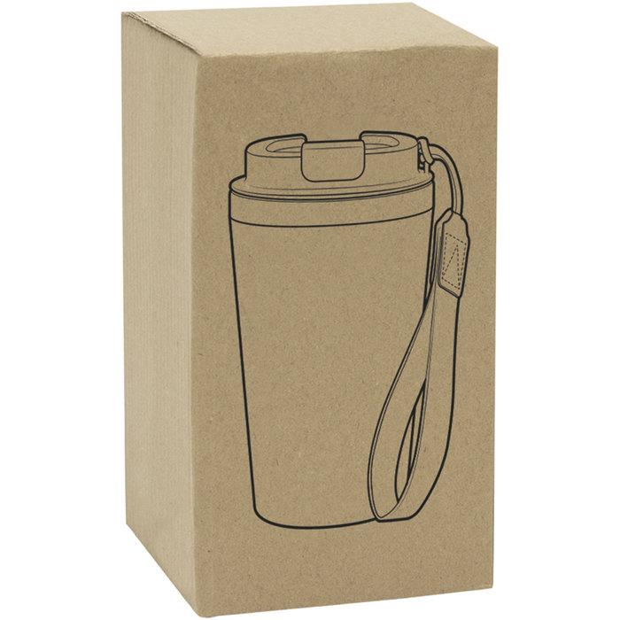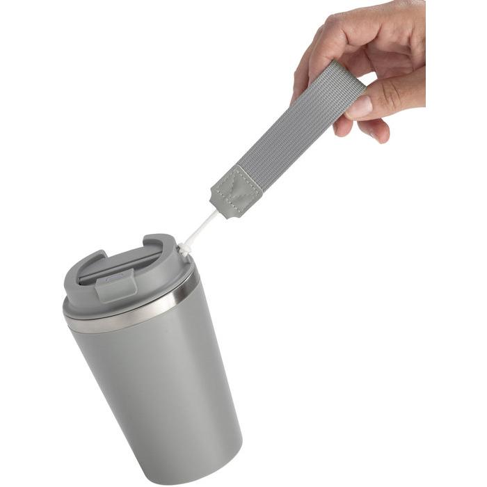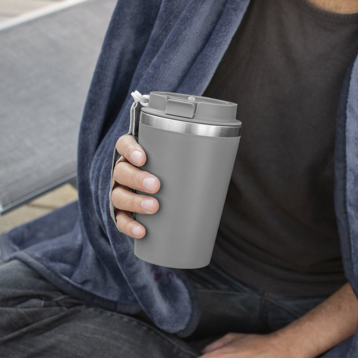 Mug doble pared con asa colgante. Interior de acero inoxidable 304 y exterior de Polipropileno con acabado mate. Tapa a rosca de polipropileno con anillo de silicona y seguro antiderrame del mismo color del mug. Asa de poliuretano y poliéster.