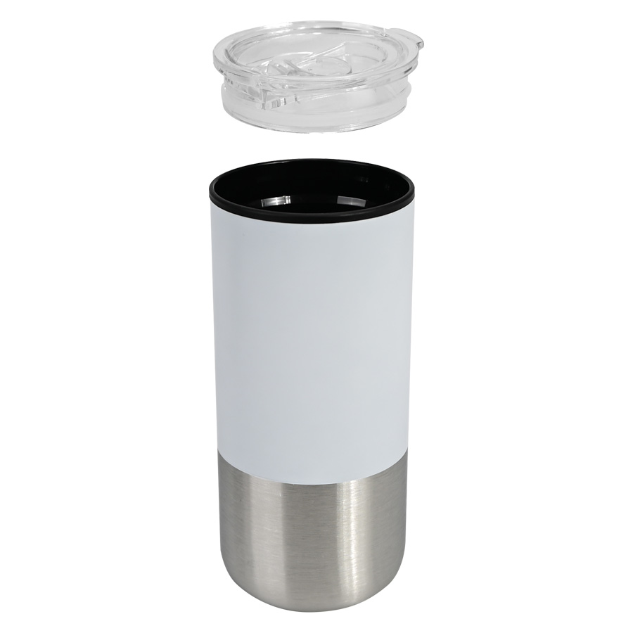 Mug metálico bicolor doble pared aislante, interior plástico PP, exterior plástico PP con pintura POWDER COAT, combinado con Acero inoxidable 201 SS, modelo «THEO». Producto BPA FREE, para el contacto con líquidos y alimentos. Fondo de silicona negra ABS anti-deslizante. Tapa removible de plástico PS Crystal Clear con sello cilíndrico de silicona. Capacidad 450ml. Presentación en bolsa PP + caja de regalo de cartón negro.