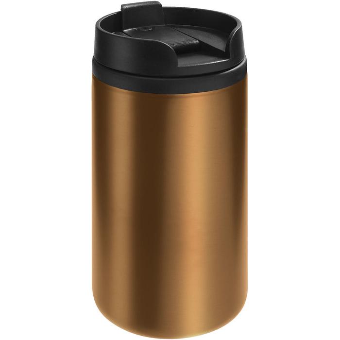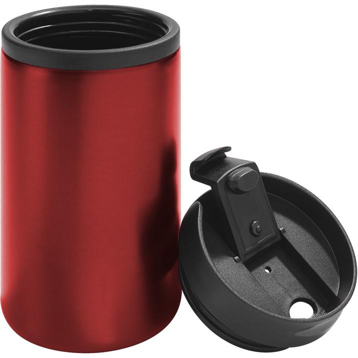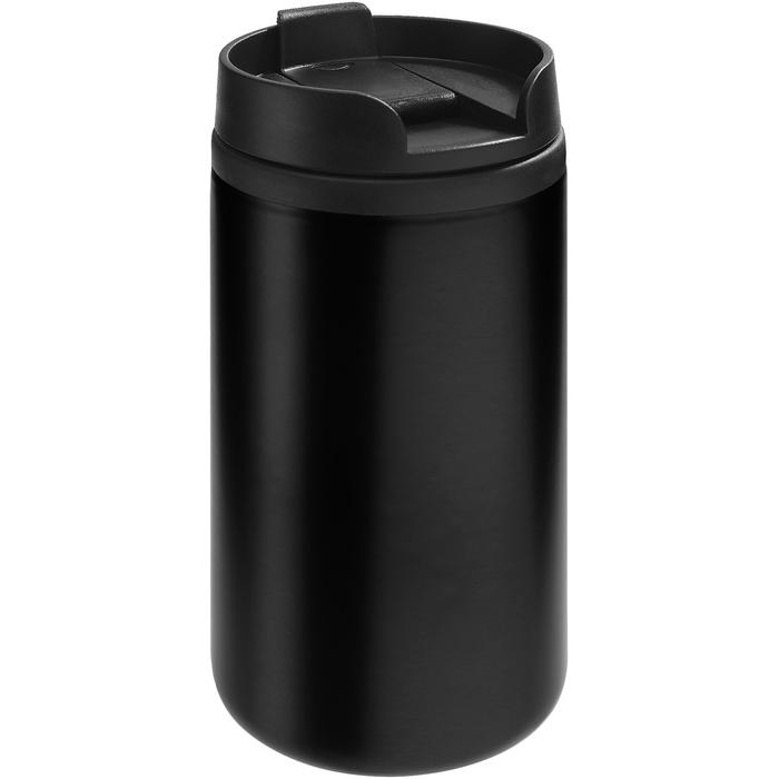 Mug doble pared, interior de plástico y exterior de acero inoxidable. Tamaño Ø 7 x 14 cm. Capacidad 290 ml. Acero inoxidable y plástico. Tapa a rosca plástica color negro con cierre a presión antiderrame. Base antideslizante. Presentación en caja de regalo.
