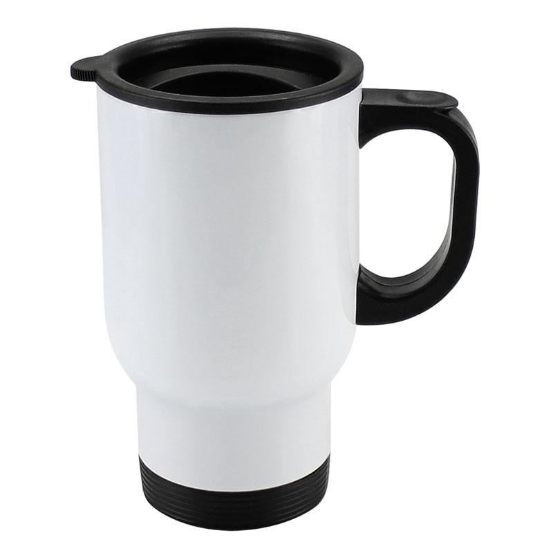 Mug Térmico Blanco de doble pared aislante, interior de acero inoxidable. Tapa, asa y base plástico negro. Cobertura exterior con polímero especial marca ORCA COATINGS(R) para una sublimación de primera calidad. Cada unidad se entrega dentro de su caja individual de cartón blanco.