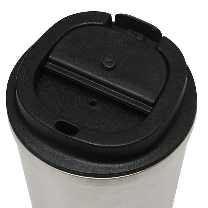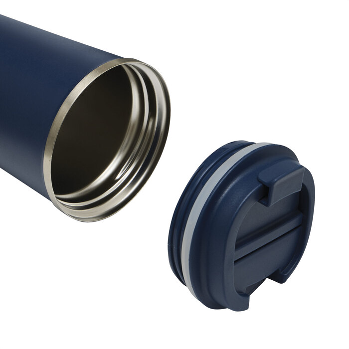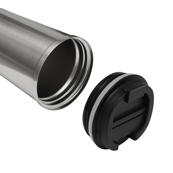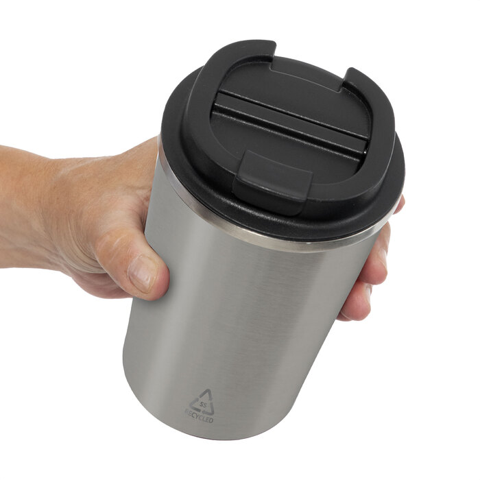 Mug doble pared, sellado al vacío. Aislamiento térmico. Tecnología vacuum. Interior en acero 304 reciclado y exterior en acero 201 reciclado. Tapa de polipropileno a rosca, del mismo color que el vaso, con anillo de silicona y seguro antiderrame. Pintura con acabado mate, textura porosa. Base de silicona antideslizante. Mantiene hasta 8 hs la temperatura de las bebidas calientes y 12 hs de las bebidas frías.