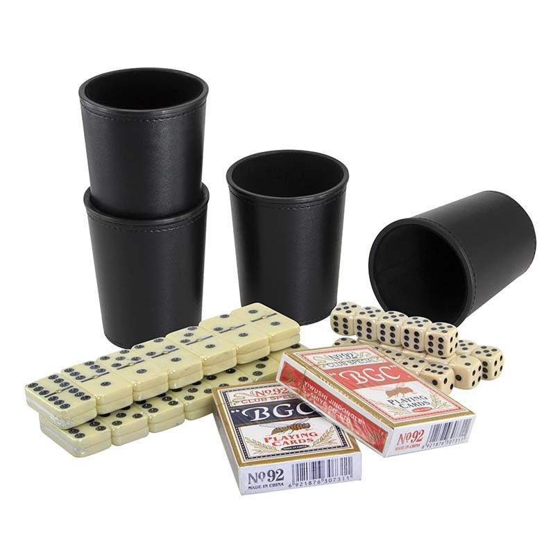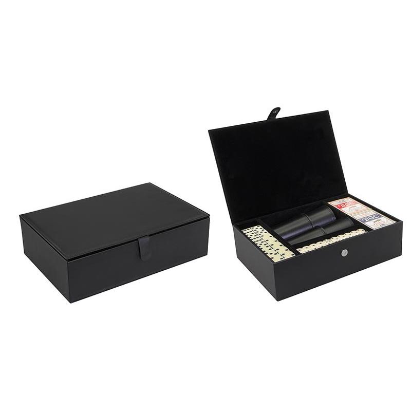 Set Multijuegos en caja grande de PU negro, con tapa con hebilla cierre magnético. Incluye 4 cachos de PU, 20 dados, 2 naipes ingleses y dominó grande.
