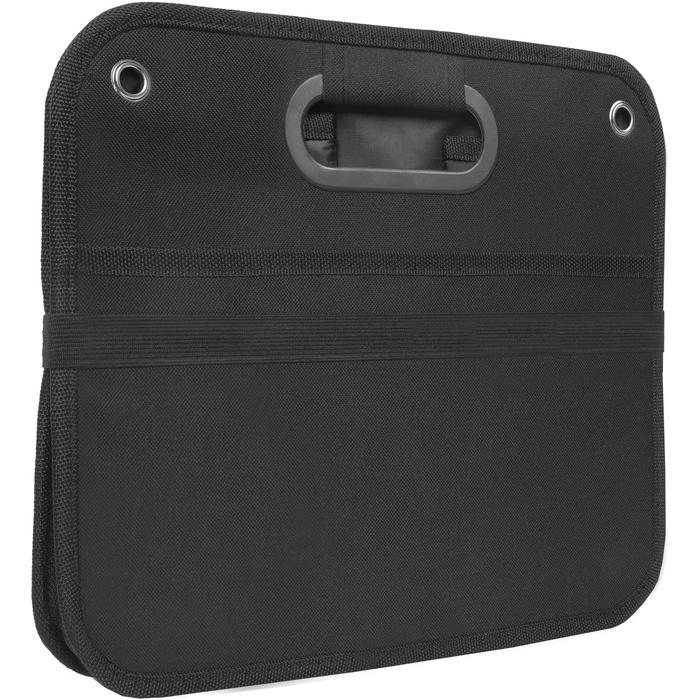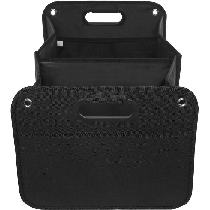 Organizador Polyester 600D. Dos amplios compartimentos de 25,5 cm (aprox) cada uno con dos estructuras de cartón que permite armar los contenedores. En uno de los compartimentos contiene un bolsillo de red. Manillas/asas recubiertas en plástico. Arandelas metálicas. En la parte inferior contiene velcro que se adhiere a la superficies. Banda elástica que mantiene cerrado el organizador cuando no esta en uso.