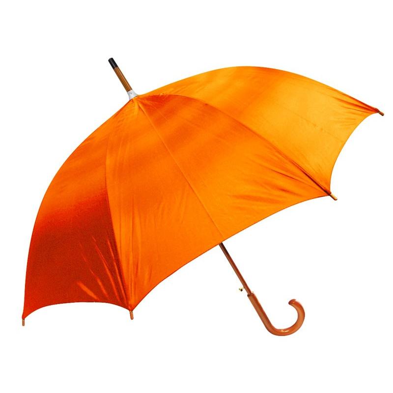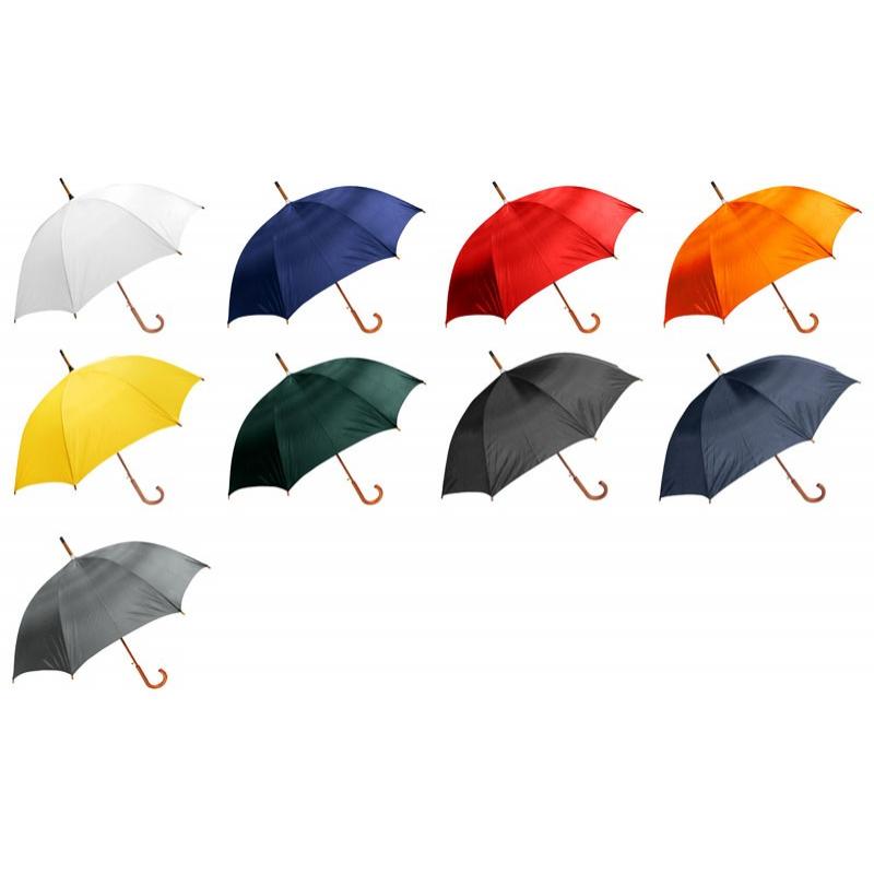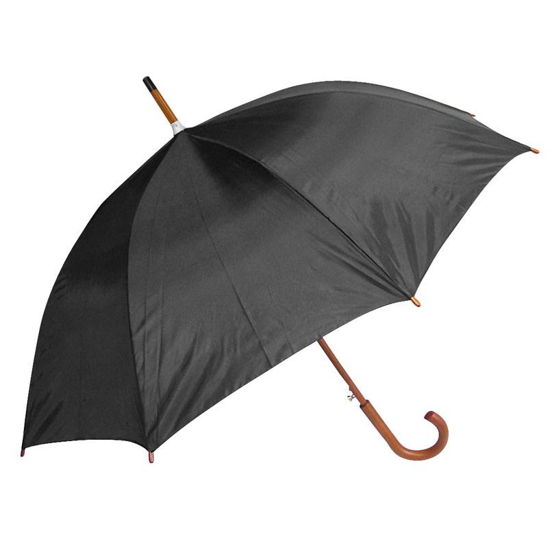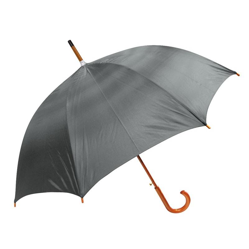 Paraguas ejecutivo con cuerpo y mango curvo de madera barnizada. Varas reforzadas de fibra de vidrio, sistema de apertura automático, 8 cascos tela Nylon 190T.