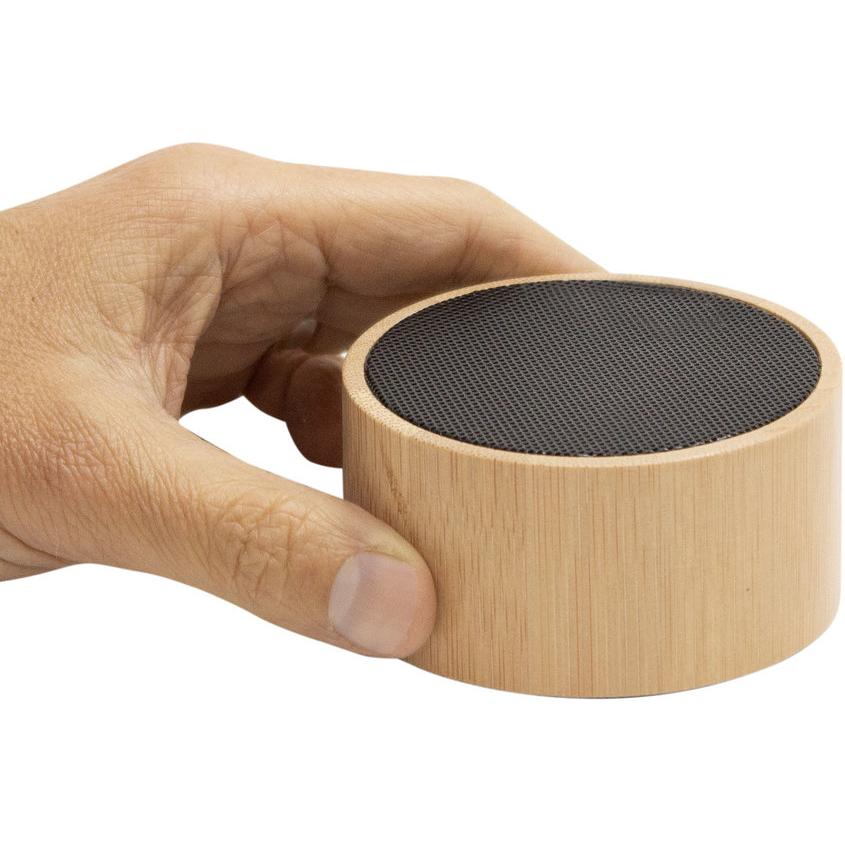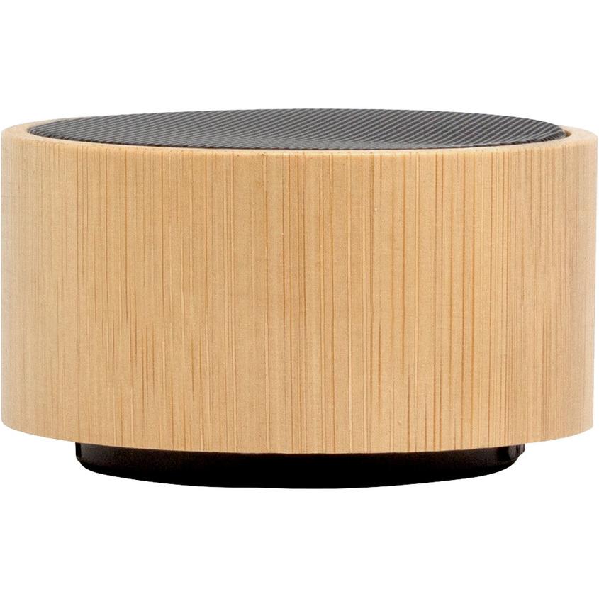 Parlante Bluetooth. Tamaño 7,5 x 4 cm. Caja redonda de Bambú color natural con malla metálica en la parte superior. Base negra con panel de control. Permite recibir llamadas. Micrófono incorporado. Versión bluetooth: 5.0. Batería: 300 mAh. Potencia: 3W. Cable de carga y conexión USB tipo C en color negro. Presentación en caja de regalo Kraft.