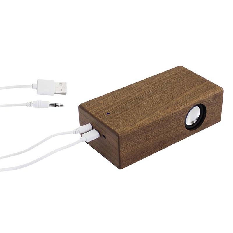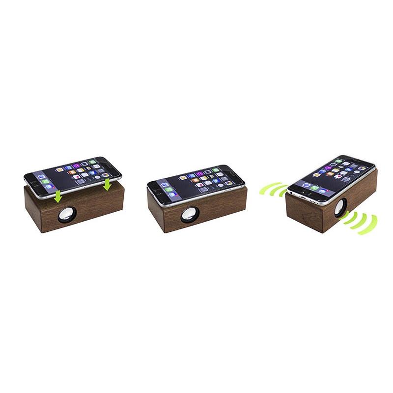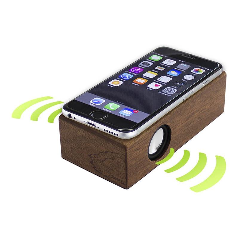 Parlante amplificador de sonido por Inducción, tamaño grande, de madera barnizada de Nogal. Ahora con mayor potencia y mejor calidad de sonido!! No necesita Bluetooth, Wi-Fi o conexión a cable. Amplifica el sonido una vez que se posa el celular sobre él, con un efecto de caja de resonancia. Compatible con cualquier modelo de teléfono celular. Contiene batería de ion-litio recargable incorporada. Incluye cable de sonido y cargador USB.