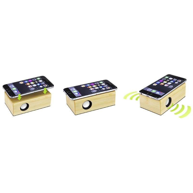 Parlante amplificador de sonido por Inducción, de madera de Bamboo. No necesita Bluetooth, Wi-Fi o conexión a cable. Amplifica el sonido una vez que se posa el celular sobre él, con un efecto de caja de resonancia. Compatible con cualquier modelo de teléfono celular. Contiene batería de ion-litio recargable incorporada. Incluye cable de sonido y cargador USB.