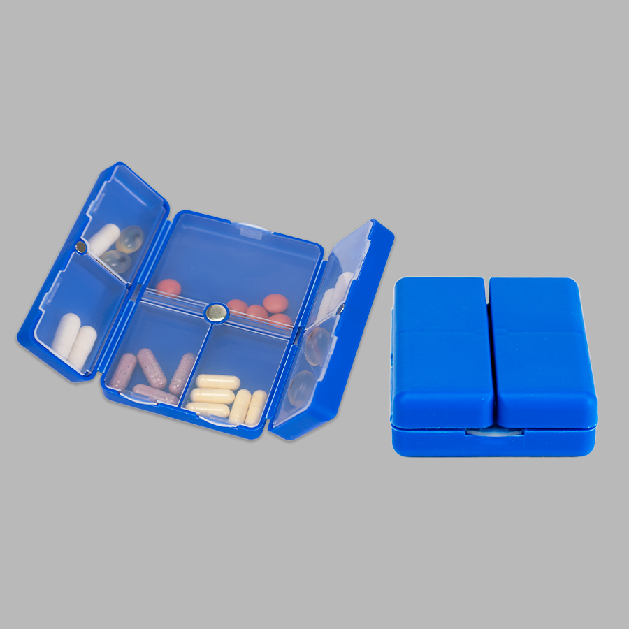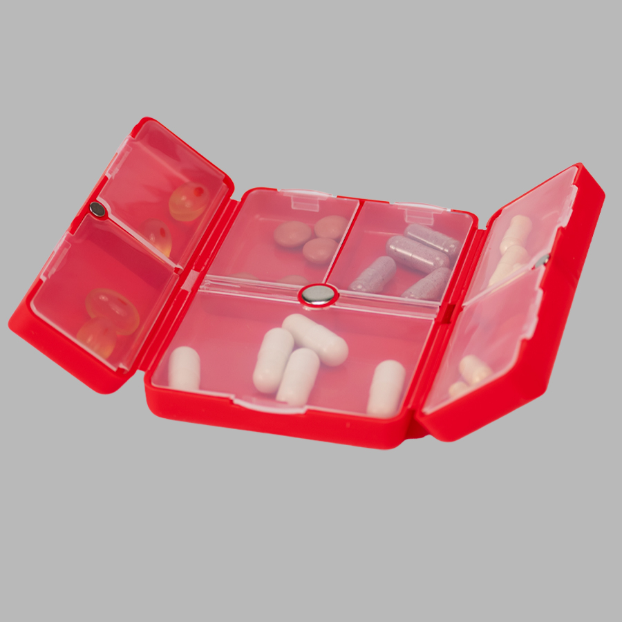 Pastillero semanal «CARE» de Polipropileno (PP). Cuenta con 7 compartimentos interiores de PVC translúcido y apertura doble tipo «libro», con cierre interior imantado. Presentación el bolsa OPP + caja de cartulina blanca.