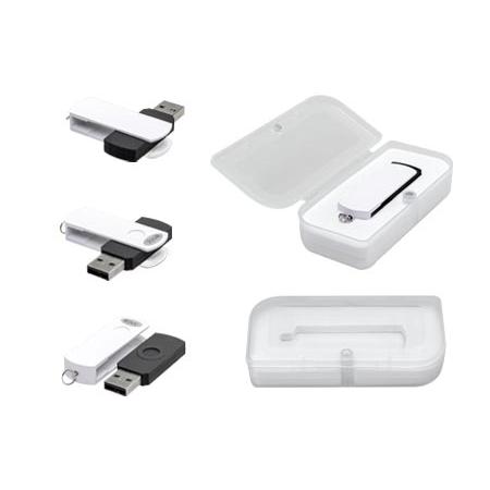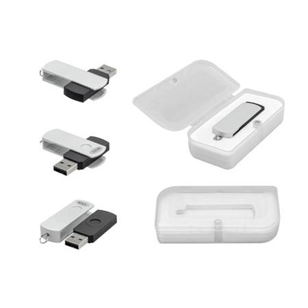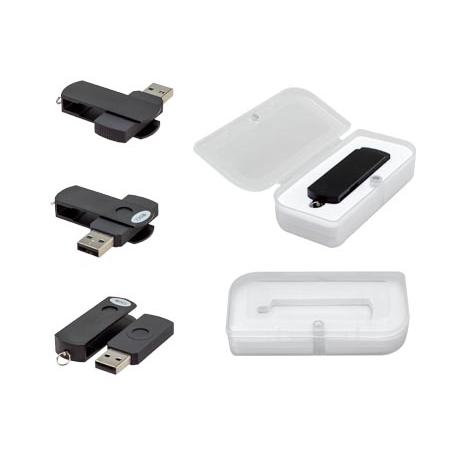 USB Pen Drive con carcaza metálica de giro en color metalizado y cuerpo de silicona negro, de 32 GB de capacidad. Incluye pequeña argolla metálica para colgar. Presentación en caja de PVC traslúcido.
