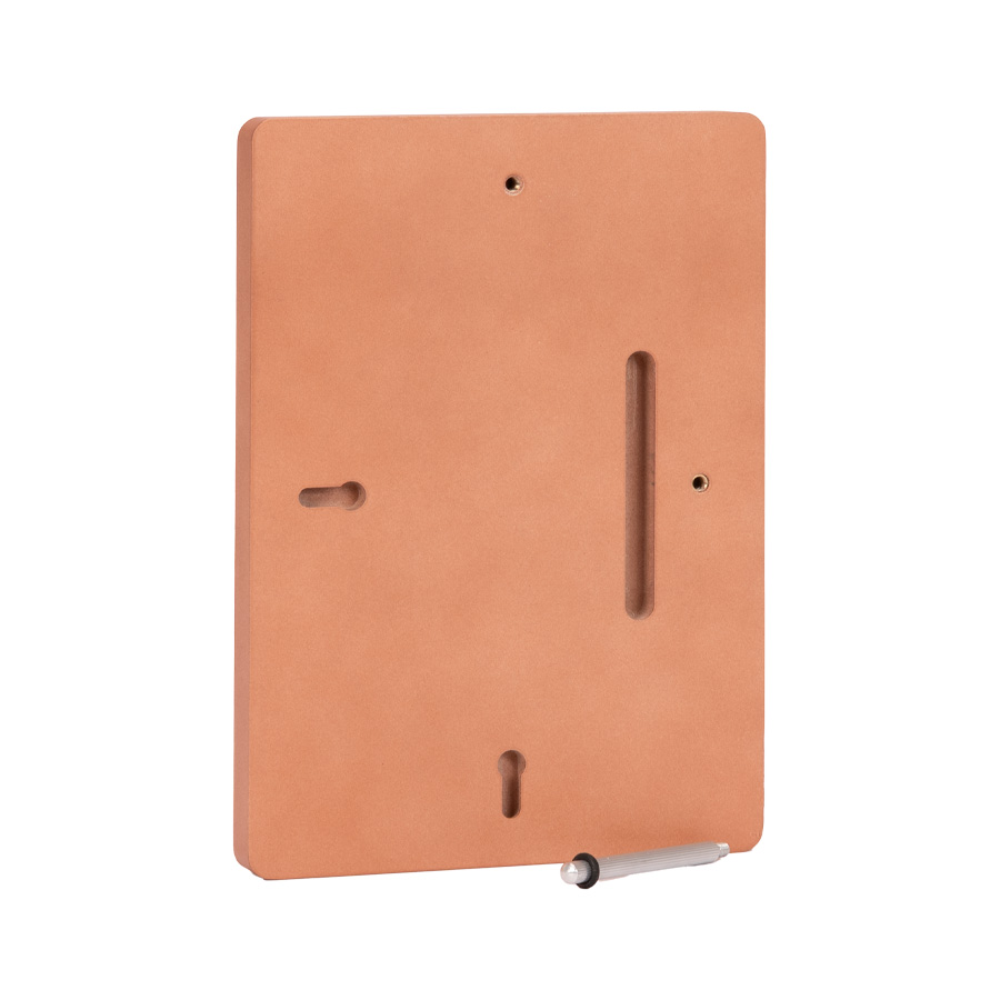Placa metálica color cobre, modelo «BLOCK», montada sobre base rectangular de madera enchapada con esquinas redondeadas. En su parte posterior, incluye orificios y soporte metálico para exhibición vertical u horizontal. Presentación en caja de cartón forrado negro con cierre imantado, interior acolchado de espuma y tela poliéster satinado negro, con troquel. OJO: la placa metálica viene con film plástico removible, para protección de la misma.