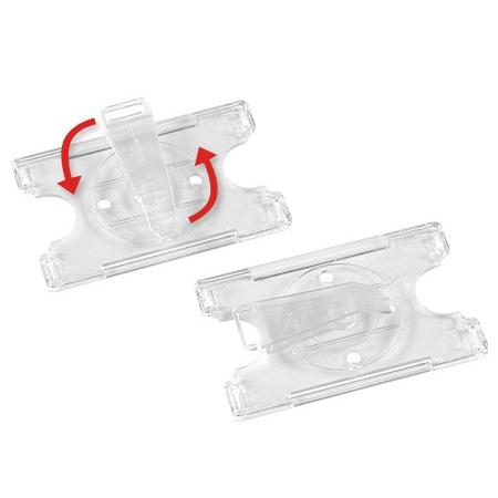 Porta-Credencial de Acrílico, para Credenciales tamaño Tarjeta de Crédito. Visibilidad por un solo lado. Con clip giratorio posterior de doble función, para presentación vertical u horizontal.