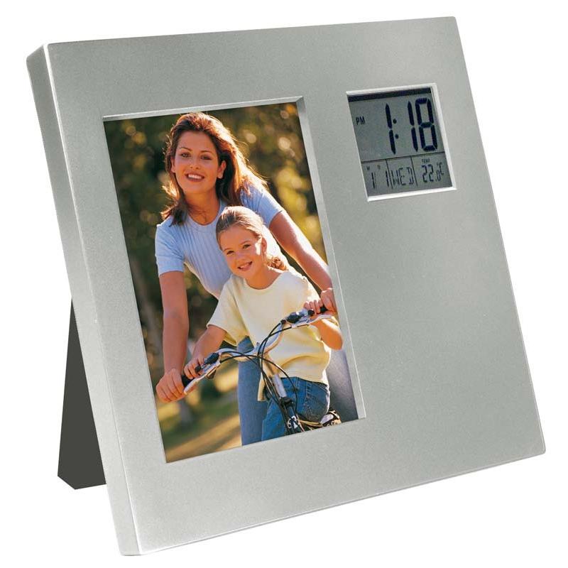 Porta-Retrato de Escritorio para foto de 13 x 9 cm con Estación Meteorológica Digital, incluye Reloj-Alarma-Calendario-Termómetro. Posición Horizontal o Vertical.
