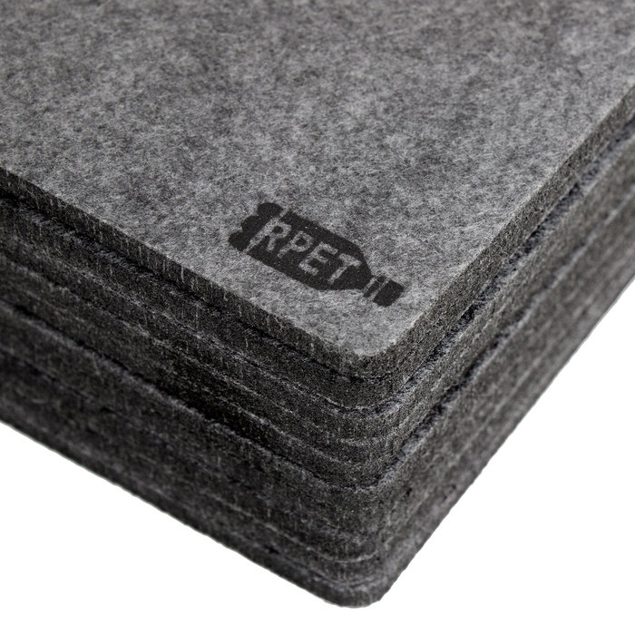 Posavasos tamaño 9 x 9 x 0,5 cm. Fieltro de plástico reciclado y Bambú. Set de 10 posavasos. El primero lleva impreso el sello RPET. Soporte de bambú de 10,5 x 10,5 x 5,5 cm. Color gris.  Presentación en caja de regalo kraft.