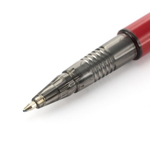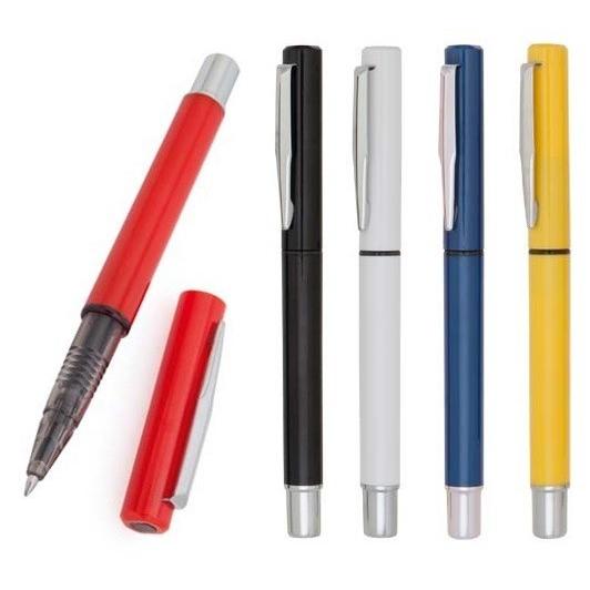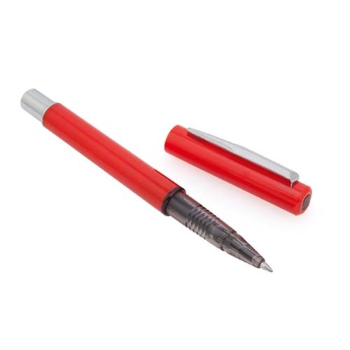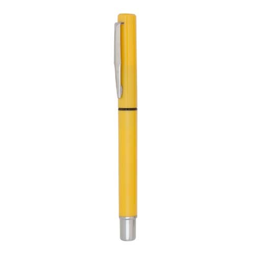 Roller de capucha con cuerpo de suave acabado sólido en colores cálidos. Con accesorios en color plateado y punta de acabado transparente, clip metálico y tinta azul.