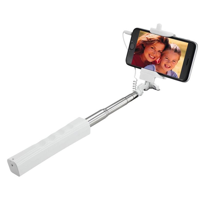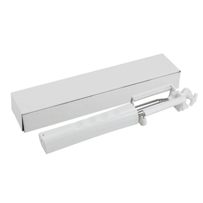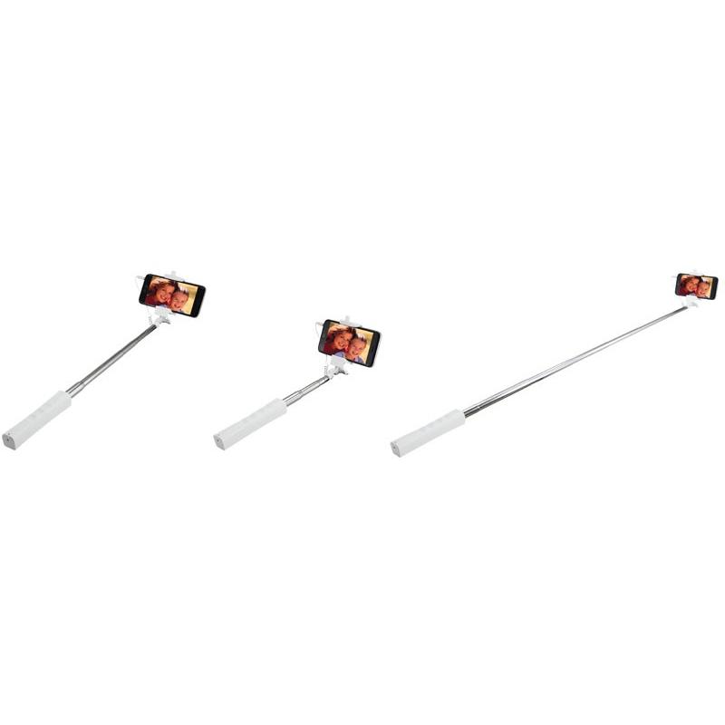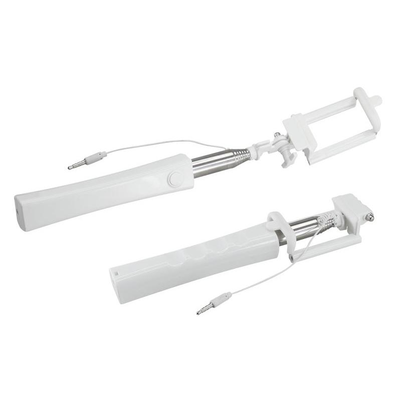 Palo extensible para Selfie “Monopod”. Largo alcance de 150cm. con tu brazo extendido. Extensión total selfie-stick desplegado: 95cm. Cerrado: 30cm. Mango plástico blanco con buen área de impresión. Contiene cable de conexión y botón de disparo. No requiere aplicaciones extras para disparo.