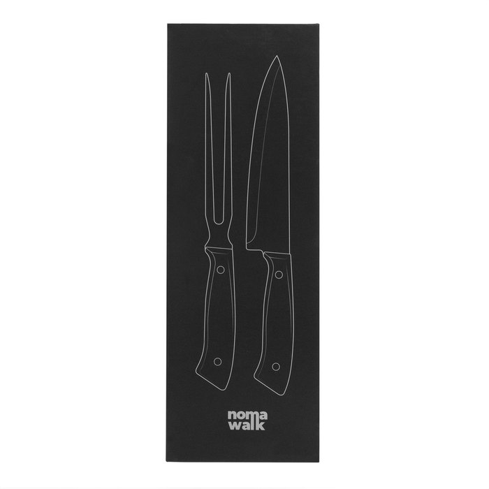 37,8 x 13 x 2,8 cm (caja cerrada). Acero inoxidable 420 y Madera de Acacia. Set de 2 utensilios: Cuchillo chef de 33,5 cm y 175 g. Tenedor de 31,3 cm y 125 g., ambos con mango de madera. Presentación en caja de regalo estilo libro.