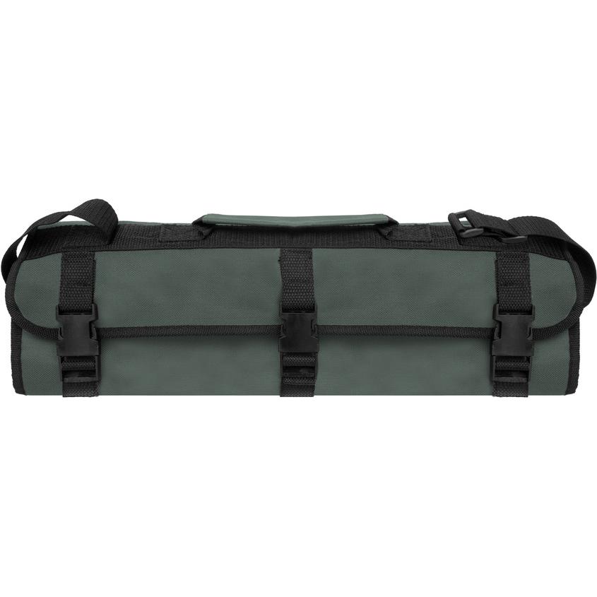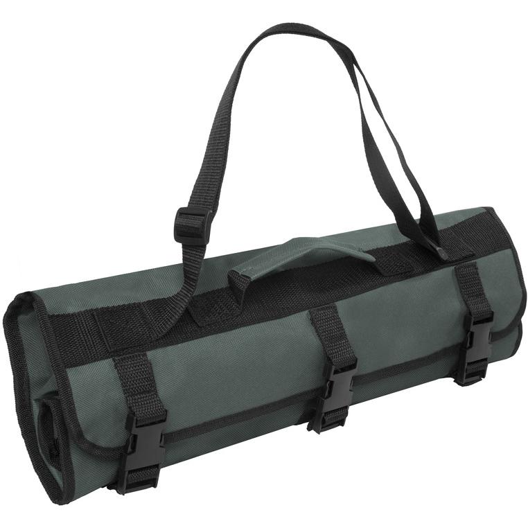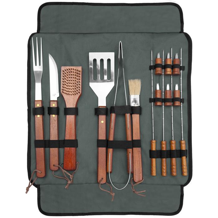 Set para asador cuenta con tenedor asador, cuchilla de acero inoxidable, cepillo de aluminio, espátula, pinza, pincel, 4 pinchos para brochetas y 6 pinchos pequeños. Tamaño Ø 9 x 46 cm. (cerrado) 60 x 46 cm. (abierto). Poliester y acero inoxidable. Estuche de polyester con manilla y tres hebillas plásticas para cerrar. Color del estuche: gris y negro.