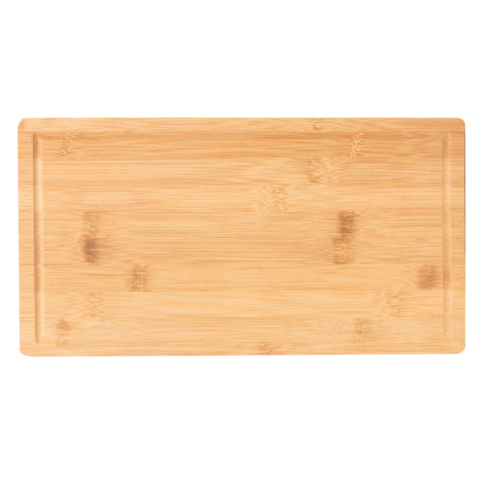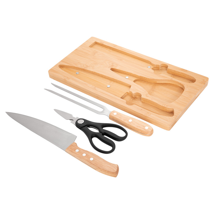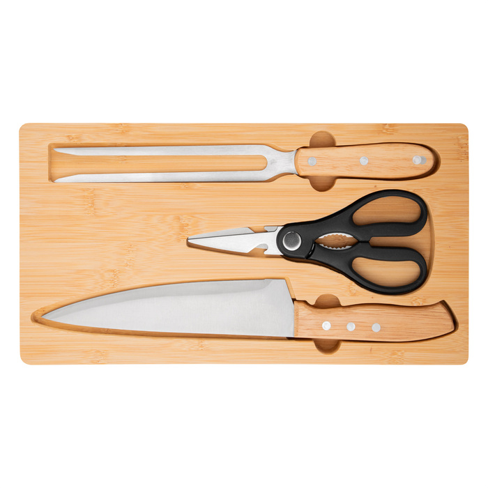 Set de asado. Tabla de corte de bambú con imán en el lado opuesto para fijar los 3 utensilios: Tijera de cocina multiuso (corte de aves, pescados, vegetales, y hierbas con abridor de botellas y rompenueces) de acero con mango plástico; Cuchillo chef y Tenedor, ambos de acero con mango de madera.