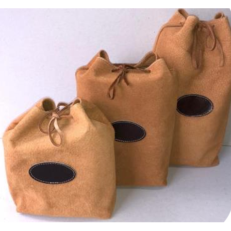 Set de cachos en cuero gamuzado, con cierre de cordón y detalle de etiqueta ovalada. Prácticos y versátiles, ideales para guardar cachos. Disponibles en tres tamaños.