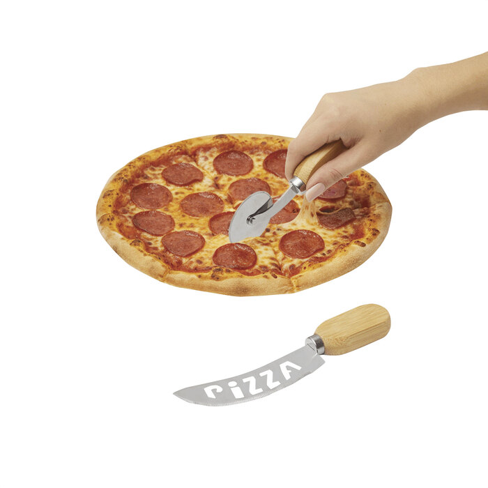 Set de corte para pizzas. Incluye 2 utensilios: Cuchillo curvo con hoja dentada y perforada para un corte limpio y eficaz; y una cuchilla circular giratoria para un corte simple y veloz, ambos con mango de bambú. Presentación en caja de regalo kraft.