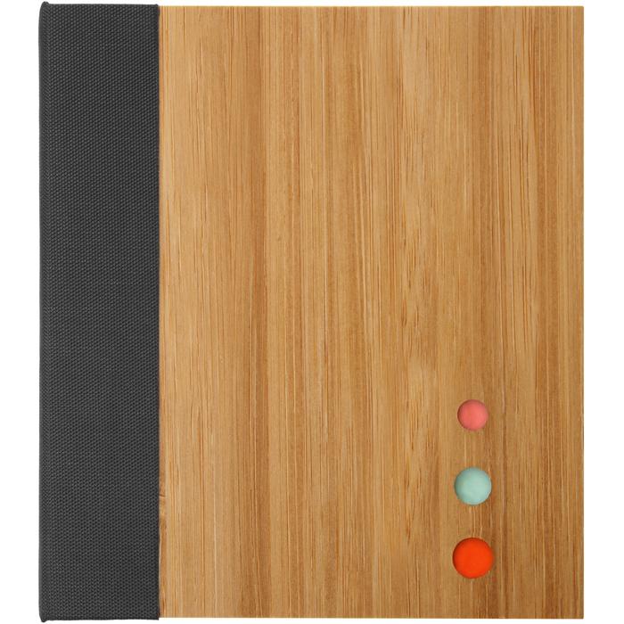Set tamaño 12 x 10,5 x 2 cm. Bambú. Contiene un bloc adhesivo rectangular de papel reciclado, un block adhesivo pequeño de color y 3 blocs en forma de flecha. El exterior del estuche es de bambú con detalles de tela, el interior es de plástico con divisiones. Presentación en caja de regalo.