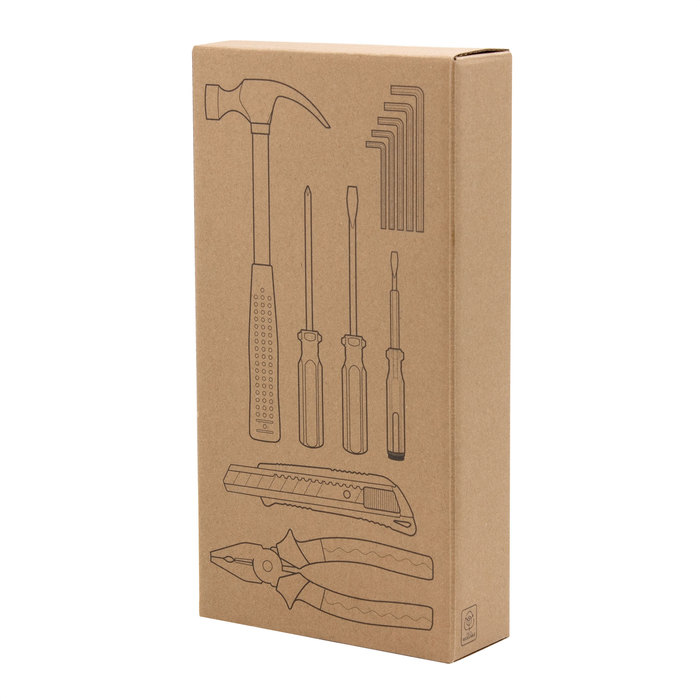 Contiene 11 piezas, todas sujetadas con elastico anti deslizante: Cuter, pinza alicate, martillo, 2 destornilladores de diferentes puntas (punta plana y punta phillps), un destornillador tester y 5 llaves allen. Presentación en caja de regalo.