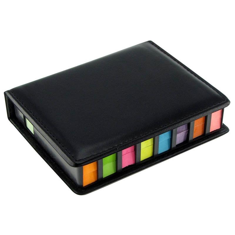 Memo Set de PU negro con Post-it y banderitas adhesivas. Incluye 200 post-it rectangulares + 200 post-it cuadrados + 1.600 banderitas adhesivas de colores. Superficie de PU liso, ideal para impresión.