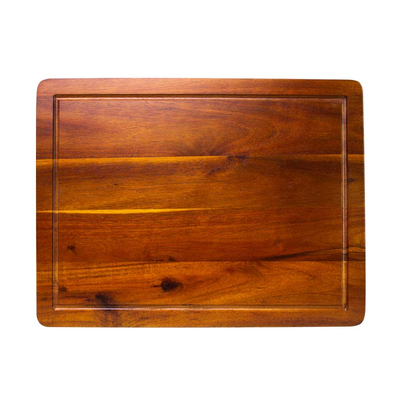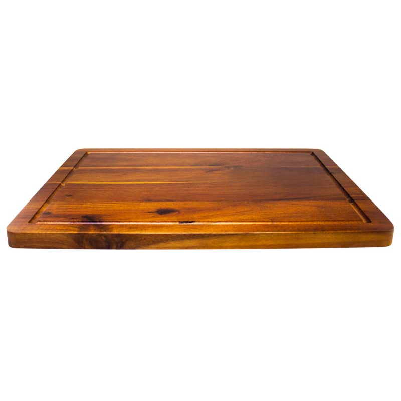 Amplia tabla de madera sólida de ACACIA, para cortar y servir carnes y pescados. Ideal también para verduras y/o selección de quesos. Madera trabajada y acabada en máquina, de forma 100% regular, con superficies, laterales y cantos lisos y suaves, para una mayor higiene y comodidad al momento de cortar y servir alimentos. La Acacia, junto con la Teca, es considerada la mejor, más dura y más resistente madera para utilizar para cortes de alimentos – Densidad aprox. 770kg/m3. – Dureza 9.5 (test de Monnin)
