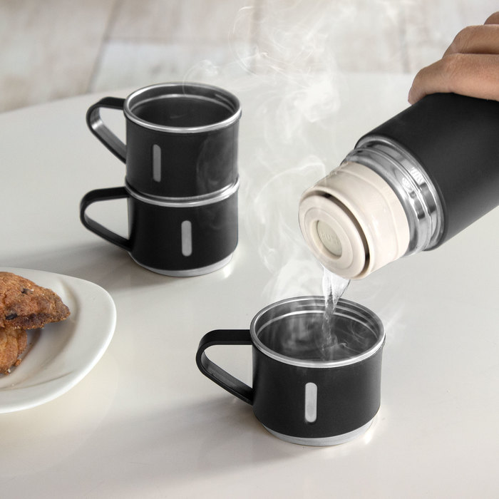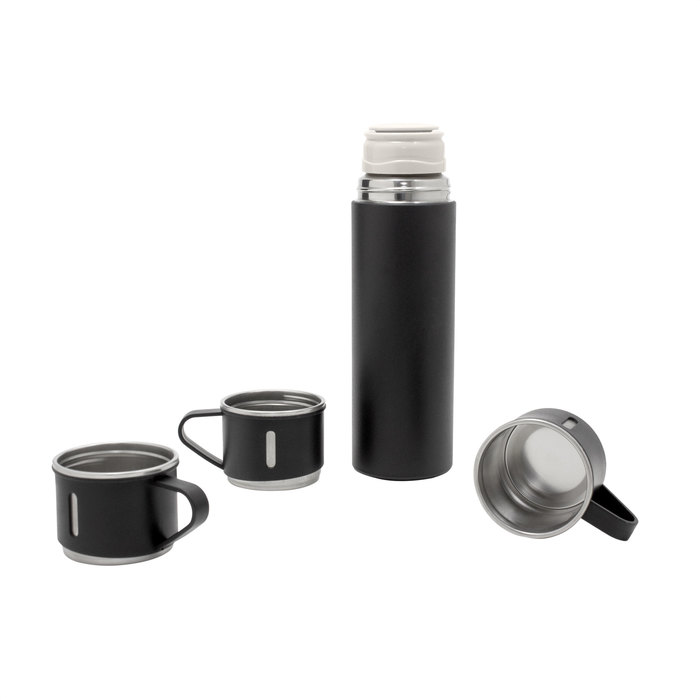 Ø 6,5 cm x 23,5 cm. Acero inoxidable y Polipropileno. Capacidad 500 ml. Set de termo y tres tazas. Termo con doble pared sellado al vacío. Acero inoxidable 304 interior / 201 exterior. Tapa y tazas Ø 6,5 cm x 5 cm. Capacidad 120 ml. Acero inoxidable 304 interior / PP exterior. Pintura acabado mate. Mantiene por más de 12 hs la temperatura de las bebidas calientes y 24 hs de las bebidas frías. Presentación en caja de regalo Kraft.