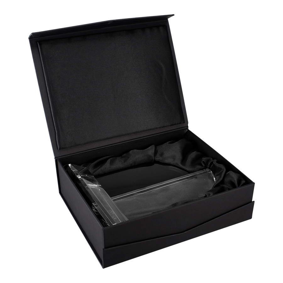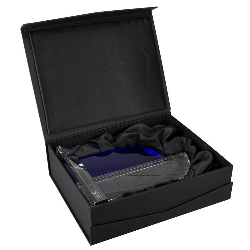 Deluxe Trofeo grande de Cristal modelo “Catedral” con aplicación de cristal-color. Presentación en caja de cartón forrado negro.