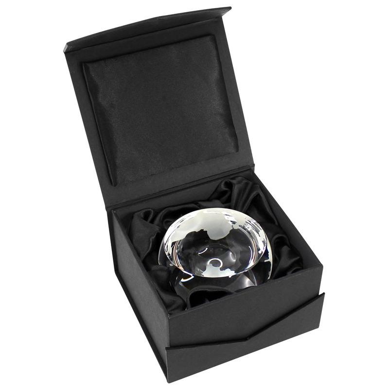 Trofeo de Cristal modelo “Planet” en forma de planeta con lado truncado. Presentación en caja de cartón forrado negro.