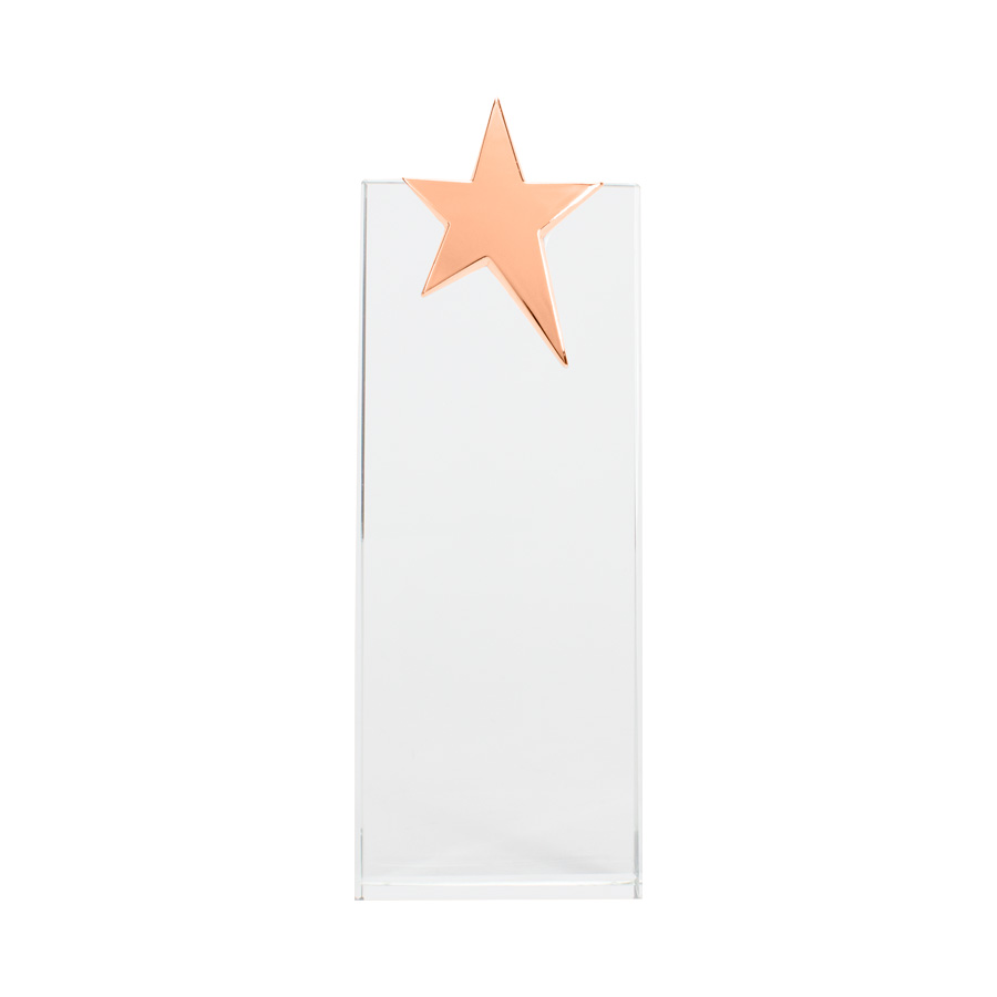 Elegante Trofeo Galvano de Cristal modelo «Ledecky», con estrella de acero inoxidable de color metalizado en su parte superior. Presentación en caja de cartón forrado negro con cierre imantado, interior acolchado de espuma y tela poliéster satinado negro, con troquel.