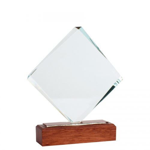 Elegante Trofeo modelo «Phelps», base de madera barnizada y cuerpo de cristal con hojas de laurel doradas en acero inoxidable. Presentación en caja de cartón forrado negro con cierre imantado, interior acolchado de espuma y tela poliéster satinado negro, con troquel.