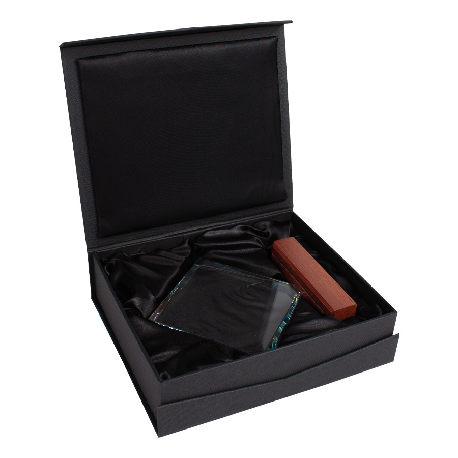 Elegante Trofeo modelo «Fischer», base de madera barnizada y cuerpo de cristal. Presentación en caja de cartón forrado negro con cierre imantado, interior acolchado de espuma y tela poliéster satinado negro, con troquel.