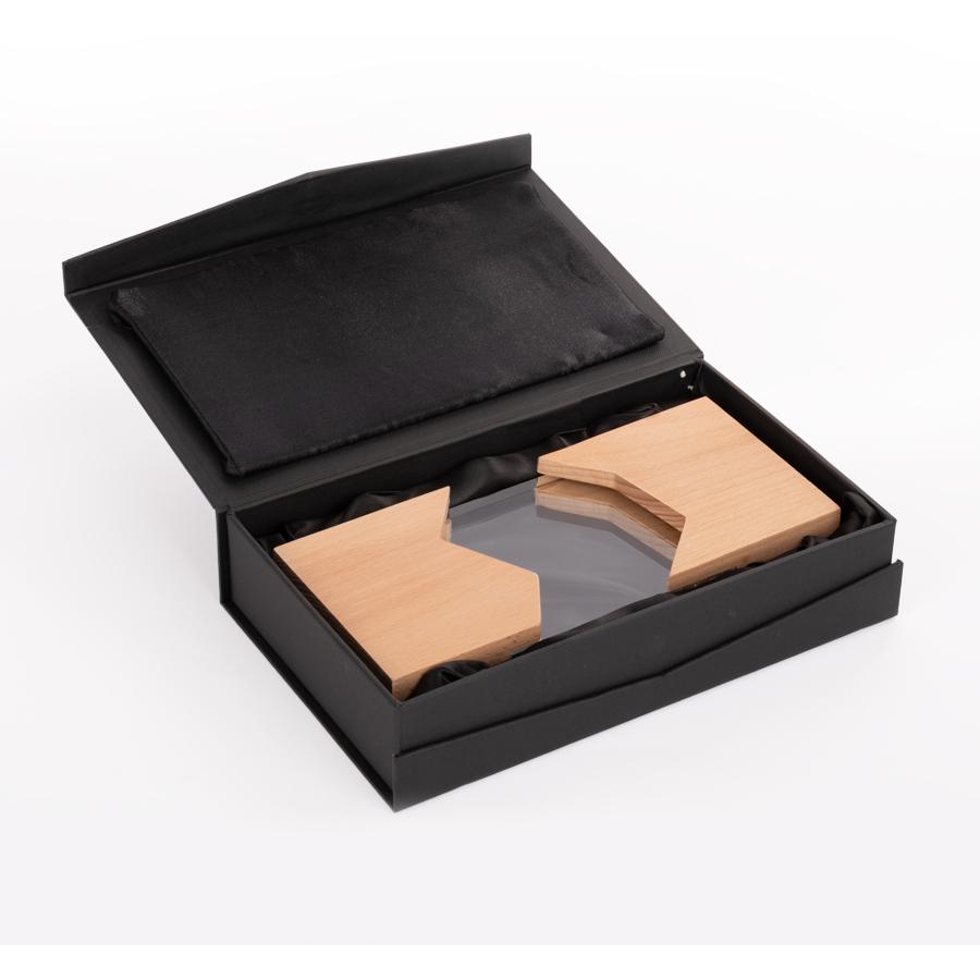 Elegante Trofeo Galvano modelo «Steven», en madera de pino barnizado, con incrustado de cristal en la zona central. Presentación en caja de cartón forrado negro con cierre imantado, interior acolchado de espuma y tela poliéster satinado negro, con troquel.